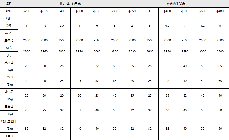 他已廣泛應(yīng)用于化工、電子、醫(yī)藥、紡織、電鍍行業(yè)的制取純水、硬水軟化、藥物和食品的脫色和提取、重要化工原料的回收以及污水處理等,聚丙烯離子交換器(柱)技術(shù)參數(shù)及外形尺寸:
